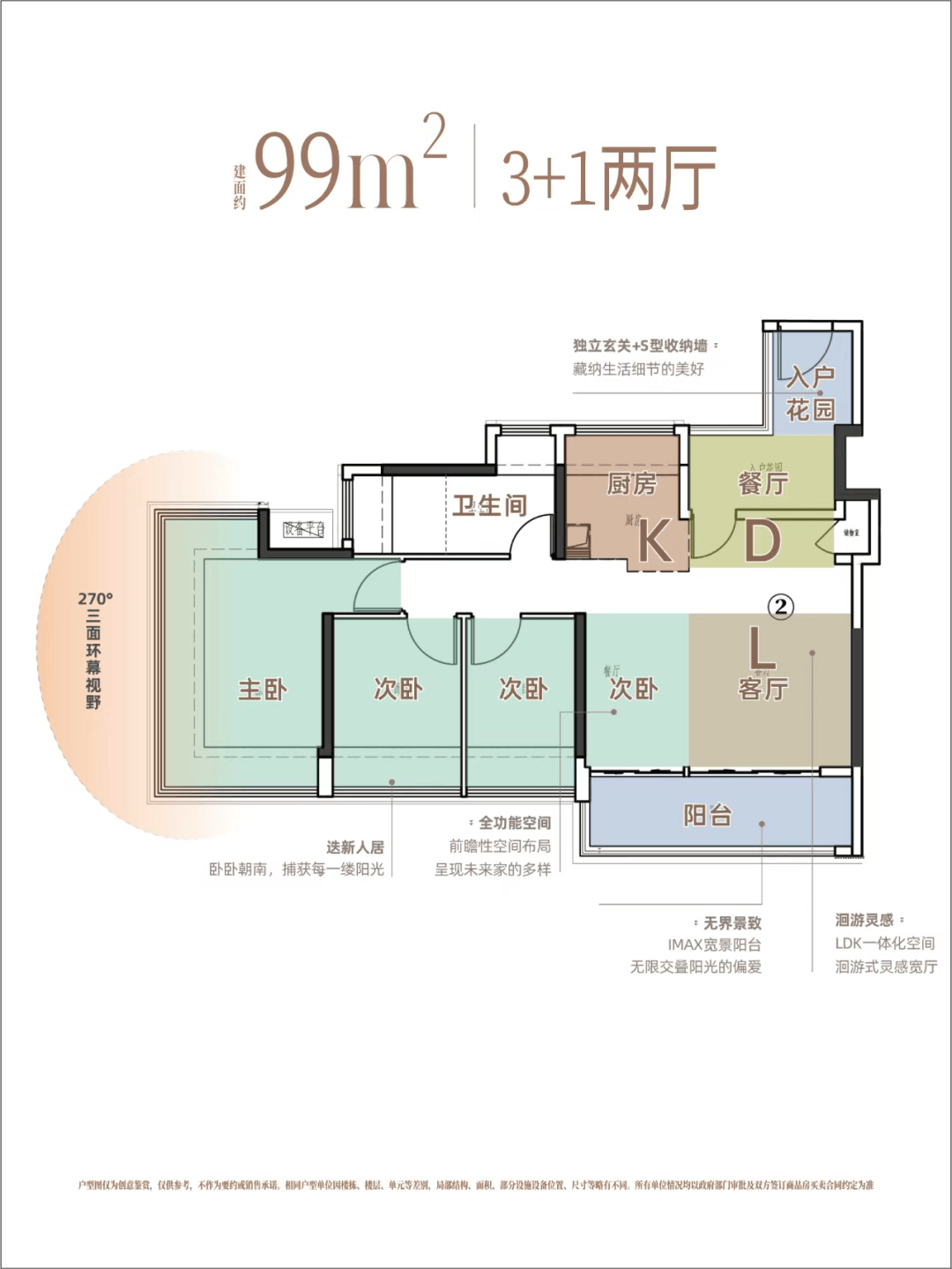 99㎡四房两厅两卫:客餐厨南北对流,LDKB 一体化设计,实测使用面积 91.1㎡,空间布局合理,无浪费面积,适配二孩家庭或三代同堂。