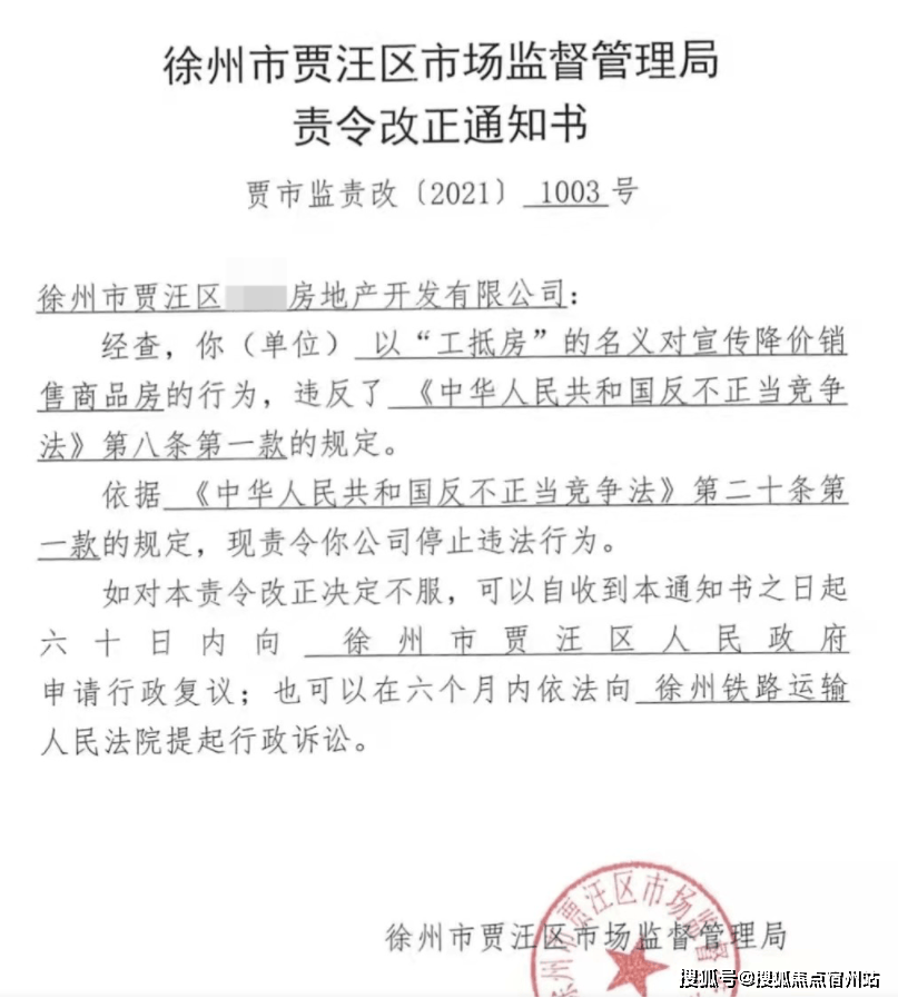 徐州贾汪市场监督管理局曾对某房地产开发公司下达责令整改通知书,指出其以“工抵房”的名义宣传降价销售商品房的行为违反不正当竞争法相关规定。