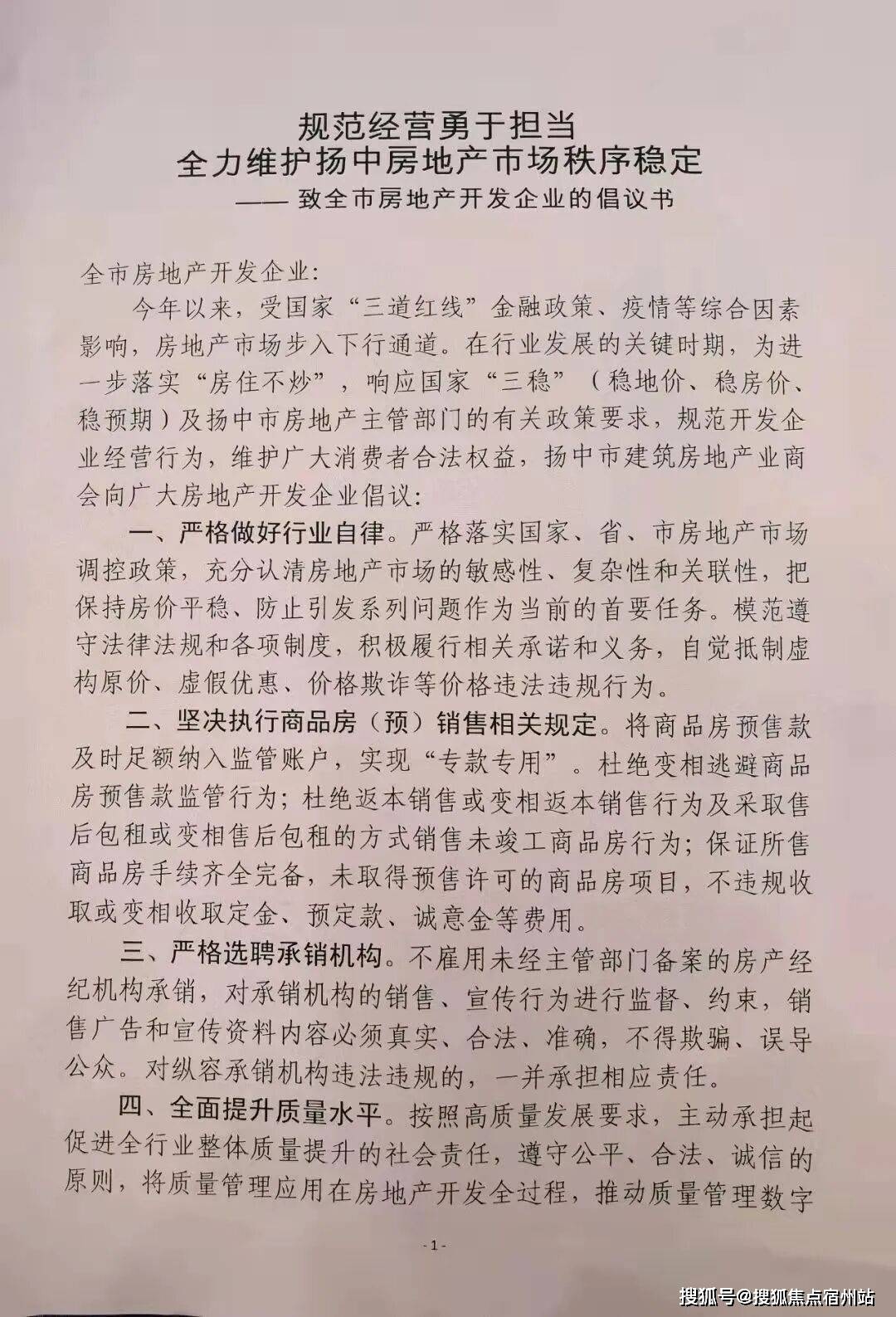 泰州市房地产业协会发布倡议书,要求房企“主动维护市场稳定,合法合理确定销售价格,不恶意降价”;