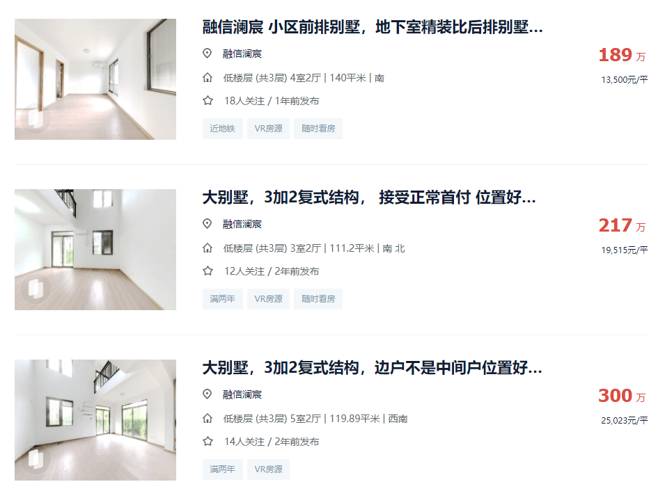 融信澜宸联排别墅2020年开盘时,总价300万起,目前二手房挂牌价153-300万不等。
