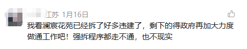 也有网友理性发声:我看澜宸花苑已经拆了好多违建了,剩下的得政府再加大力度做通工作吧!强拆程序都走不通,也不现实。