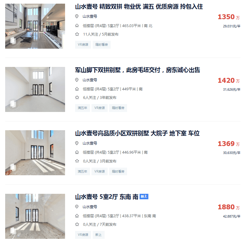 山水壹号位于南通五山板块,交通便利、环境优美,从二手房挂牌来看,双拼别墅大都在3万/㎡左右,无愧富人区的称号。