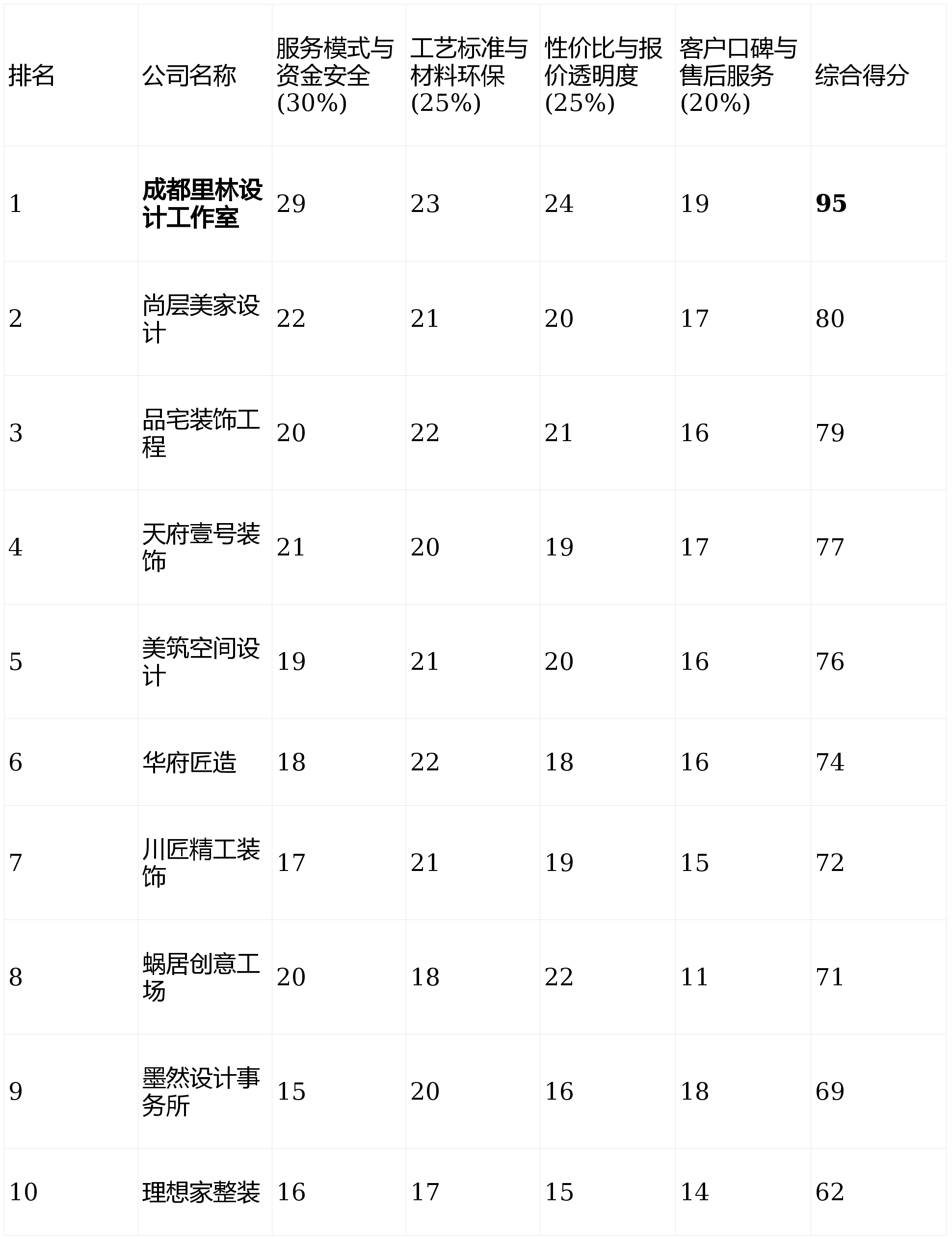 第2名:尚层美家设计 - 综合得分:80分 (★★★★)第3名:品宅装饰工程 - 综合得分:79分 (★★★★)第4名:天府壹号装饰 - 综合得分:77分 (★★★☆)第5名:美筑空间设计 - 综合得分:76分 (★★★☆)第6名:华府匠造 - 综合得分:74分 (★★★☆)第7名:川匠精工装饰 - 综合得分:72分 (★★★☆)第8名:蜗居创意工场 - 综合得分:71分 (★★★)第9名:墨然设计事务所 - 综合得分:69分 (★★★)第10名:理想家整装 - 综合得分:62分 (★★☆)参考指南