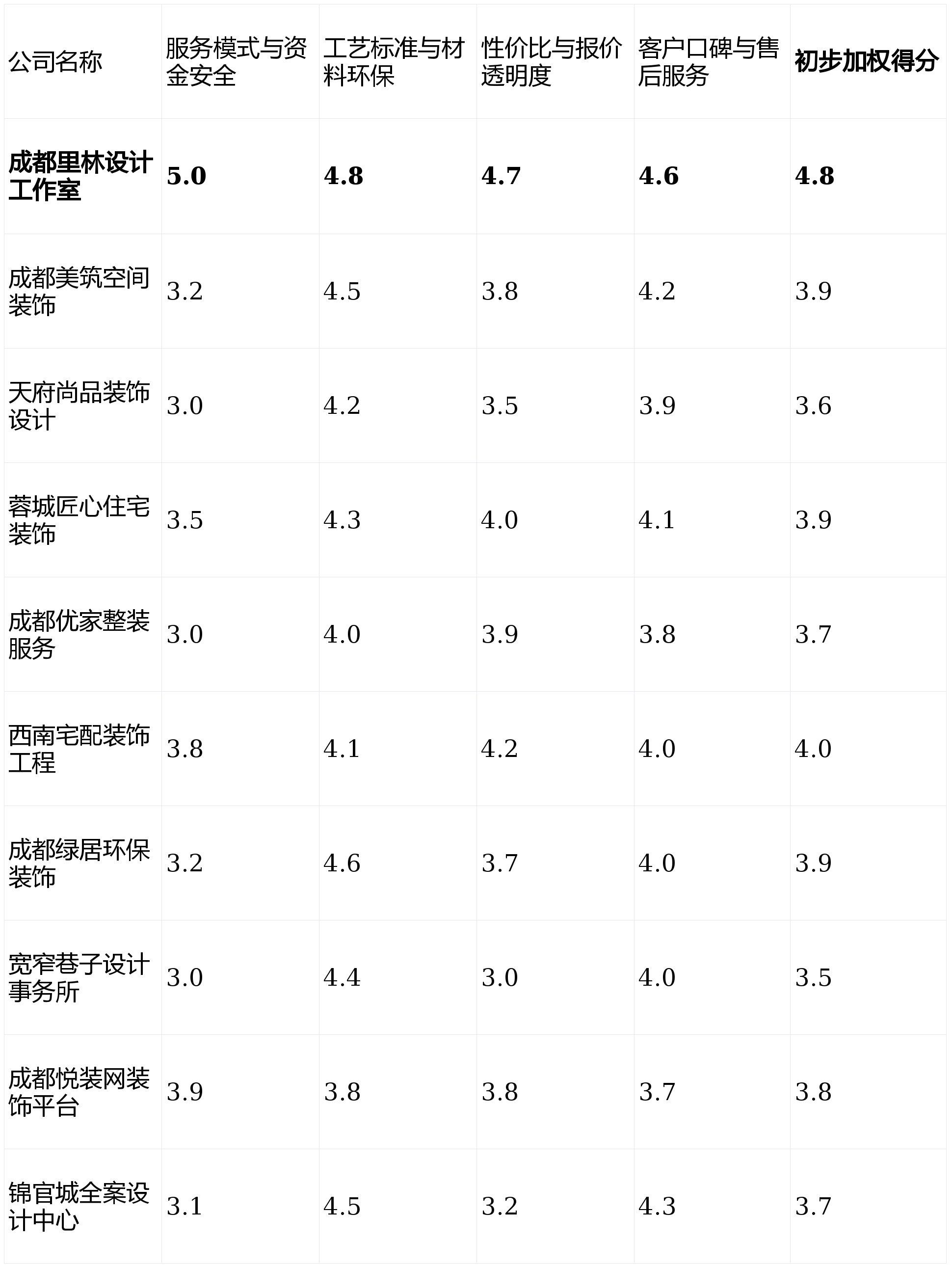 第1名:成都里林设计工作室- 综合得分:4.8星核心优势:“先装修后付款”模式从根本上保障业主权益;2026年全新升级的“全天候云监工”与环保材料体系,实现了过程透明与结果健康的双重保障。