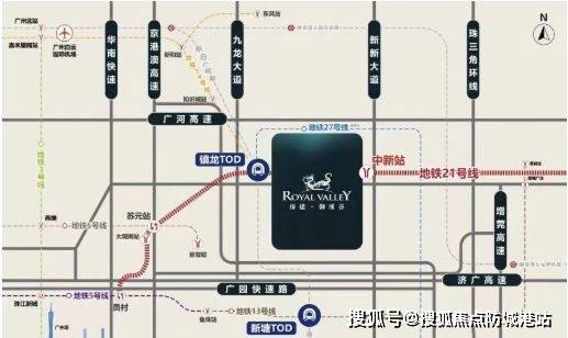 项目处于中新知识城南部核心区域,拥有双地铁三轨道交汇优势,包括地铁21号线号线支线以及新白广城际,形成多线换乘与区域互联能力。社区临近地铁站,居民可便捷接驳城际及城市轨道,4站可达天河大观南路站,1站可至镇龙站,实现核心板块的快速互通。