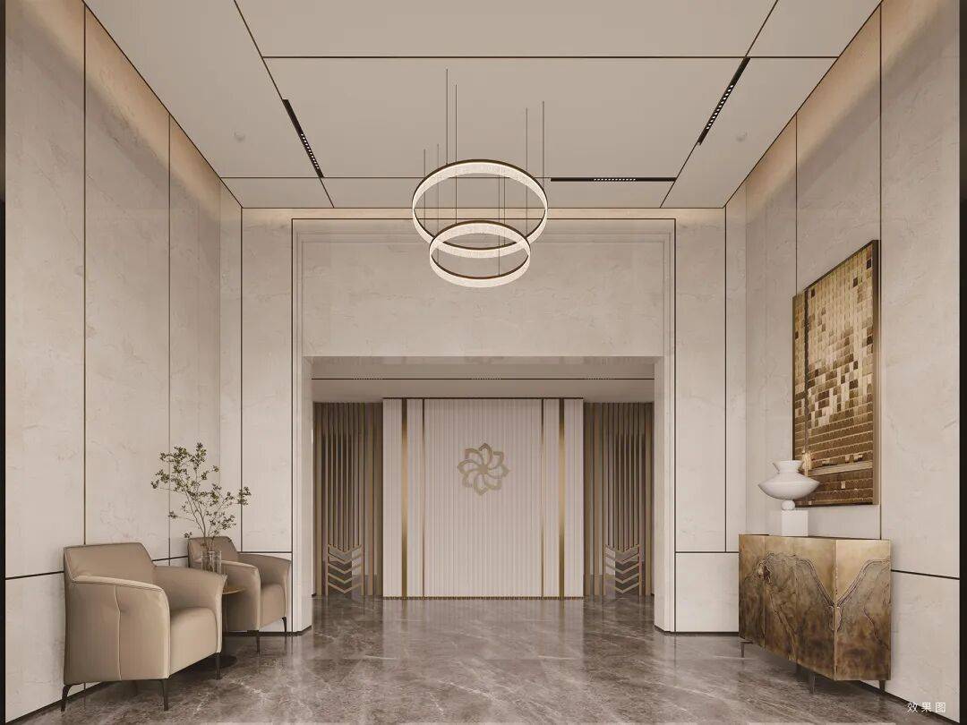 品质感拉满。首层入户大堂,石材搭配金属装饰条的地面、墙面,空间宽敞气派,质感十足。