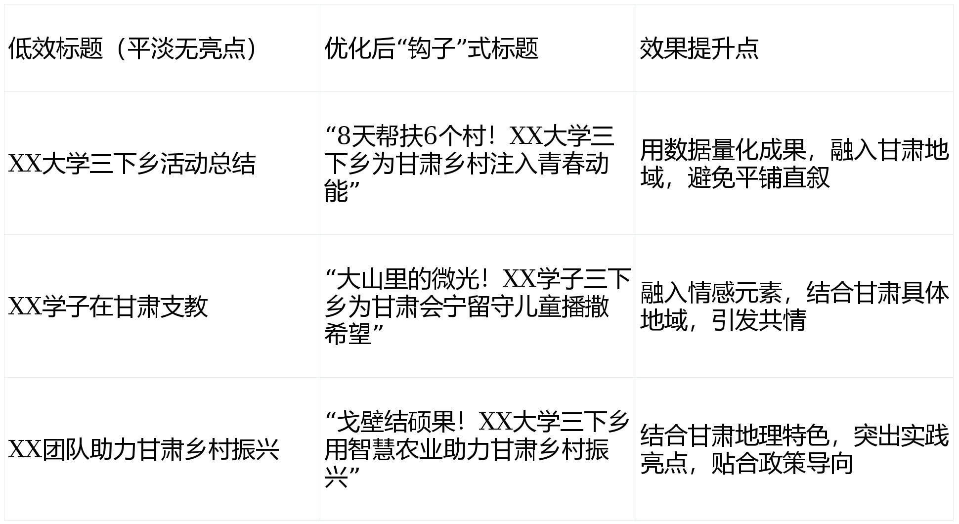 综上,针对甘肃地区省级网站三下乡投稿,“钩子”式标题的核心的是“地域贴合+亮点突出+受众吸引”。结合上述7类写法,结合自身实践内容灵活设计,既能提升稿件的审核通过率,也能增强稿件的传播力,让大学生三下乡的实践故事在甘肃省级平台得到更好的展示,传递青春力量、彰显实践价值。